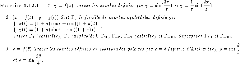 > animate(sin(x*t),x=-10..10,t=1..2,frames=50); > # D'abord on g\'en\`ere une table de points implicites > for i from 0 to 8 do > P[i]:=implicitplot(x^3+y^3-5*x*y=1-i/4,x=-3..3,y=-3..3); > od; > #pour chaque P[i] on selectionne les courbes: > for i from 0 to 8 do > C[i]:=[op(1,P[i])]; > od; > plot(animate(seq(C[i],i=0..8))); # ne marche pas... > plots[display]([seq(P[i],i=0..8)],insequence=true);